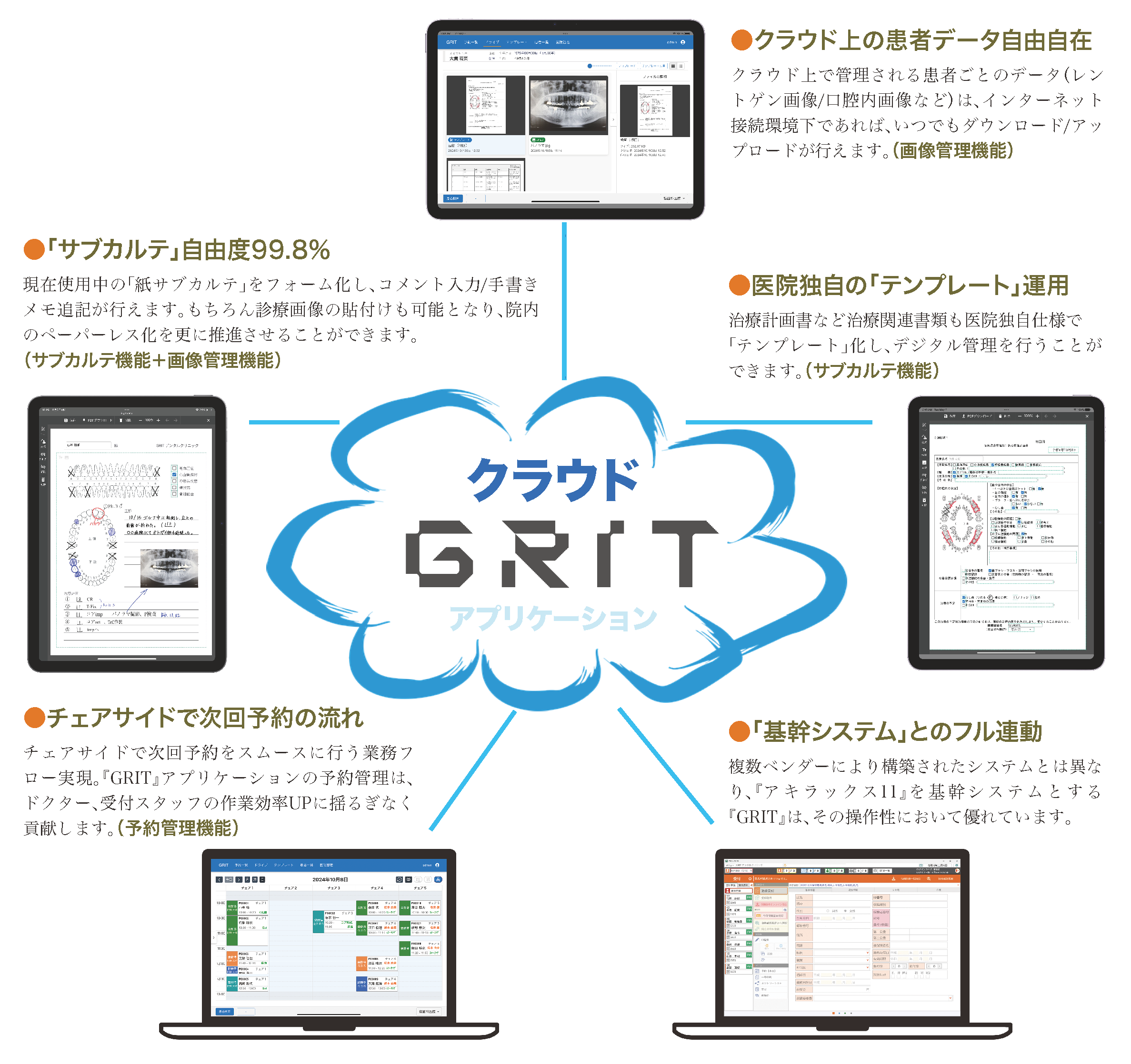 『アキラックス11GRIT』は、サブカルテ・予約管理・画像管理機能を搭載し、医療DXを進める医院にとって、コストパフォーマンスに優れたオフィス環境をご提供いたします。 |